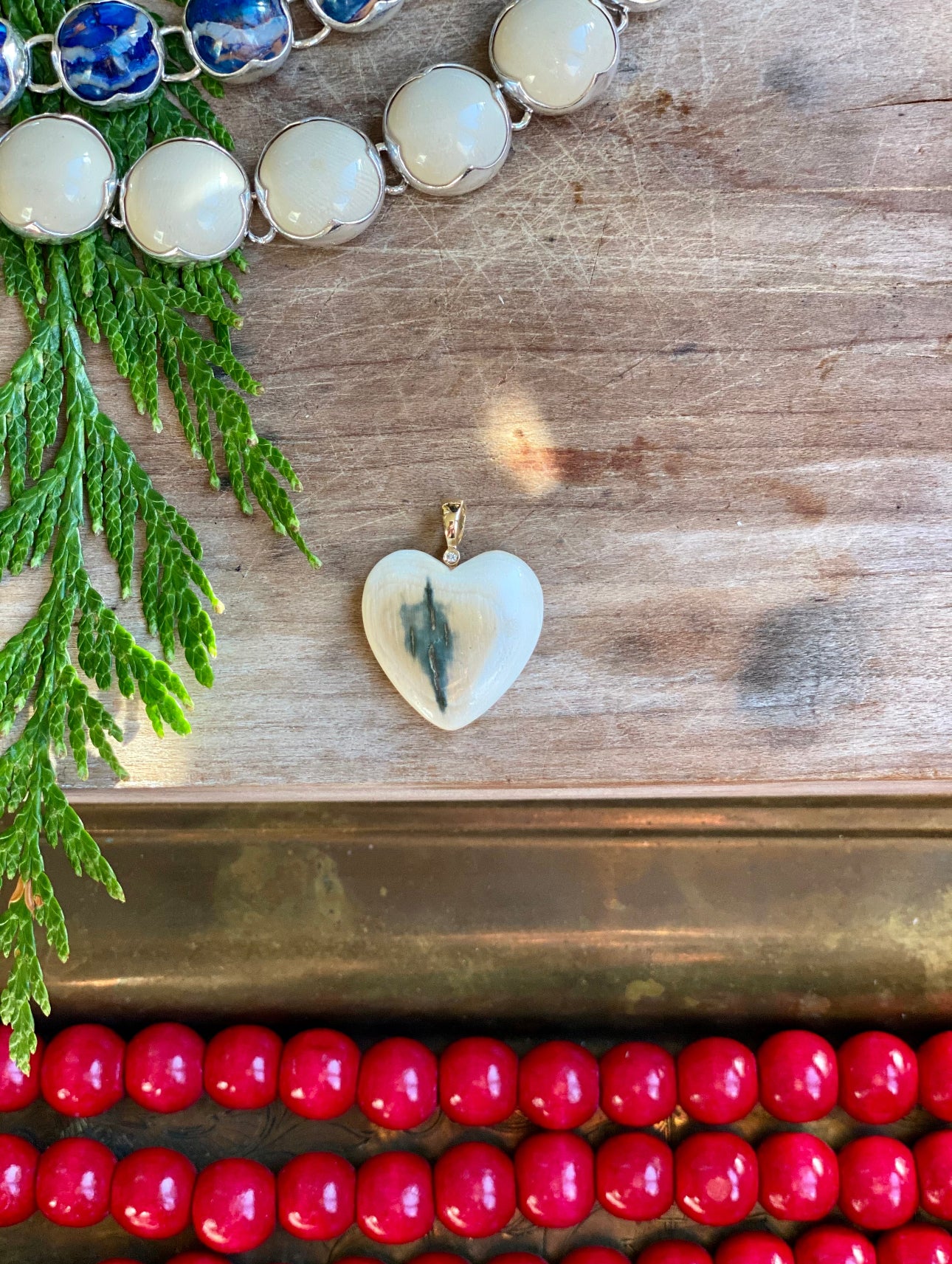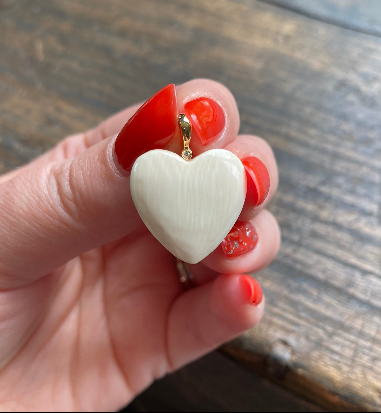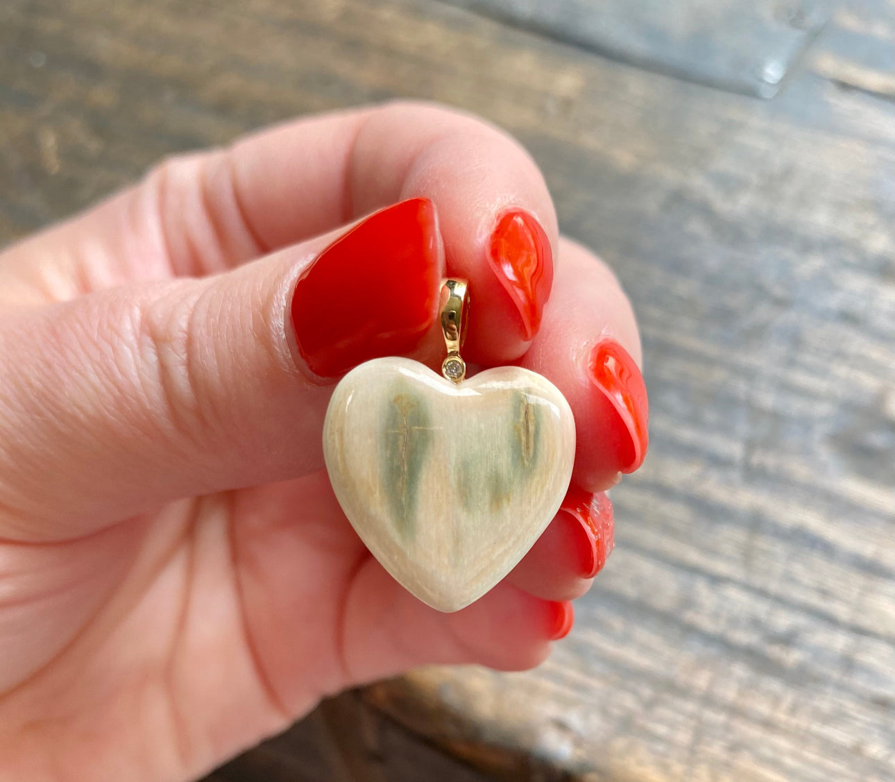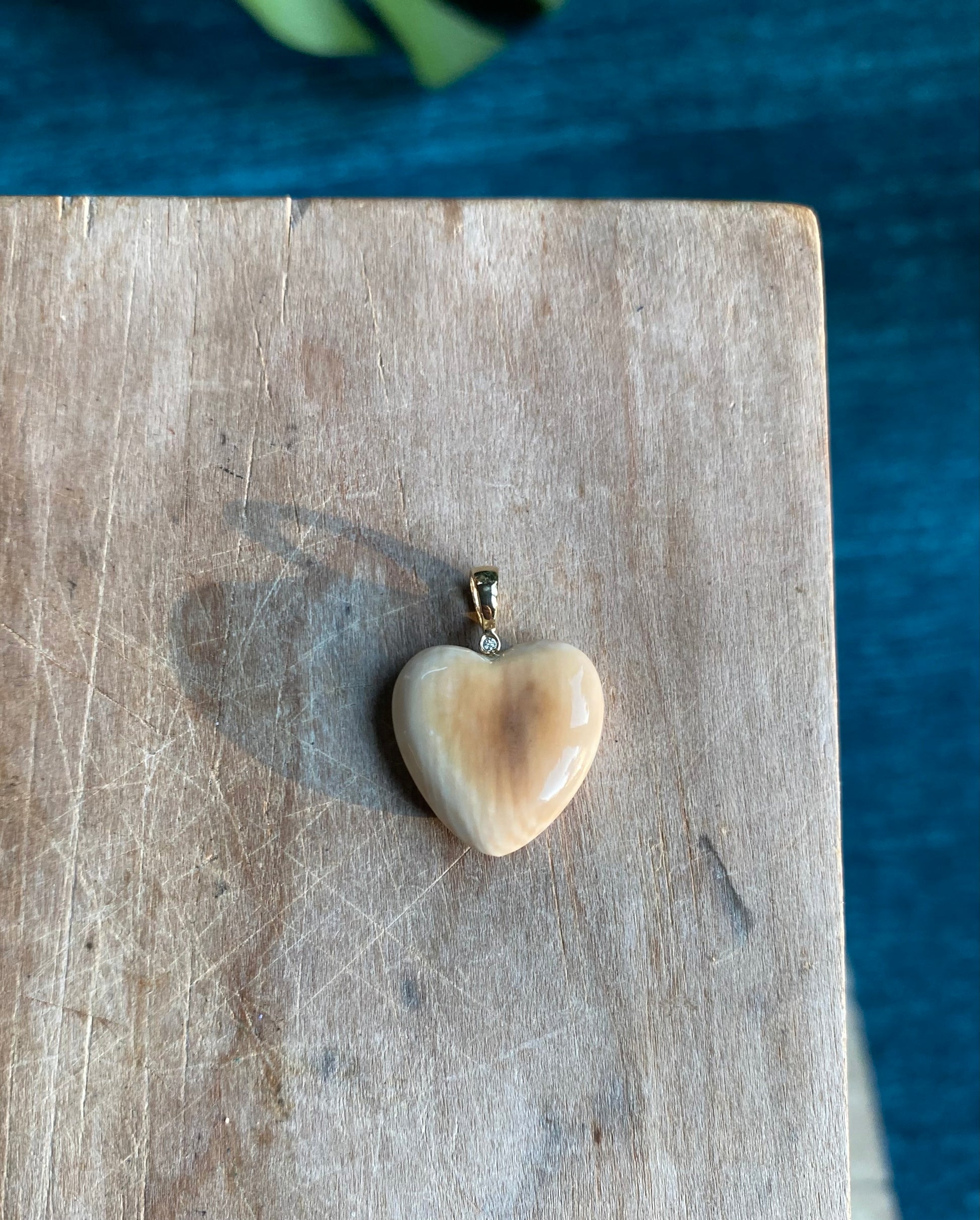 Our prehistoric woolly mammoth ivory heart pendant features beautiful natural coloration and is set with a solid 14kt gold and single diamond bail. Each heart pendant is a one of a kind and will vary from photographed pieces due to natural coloration.