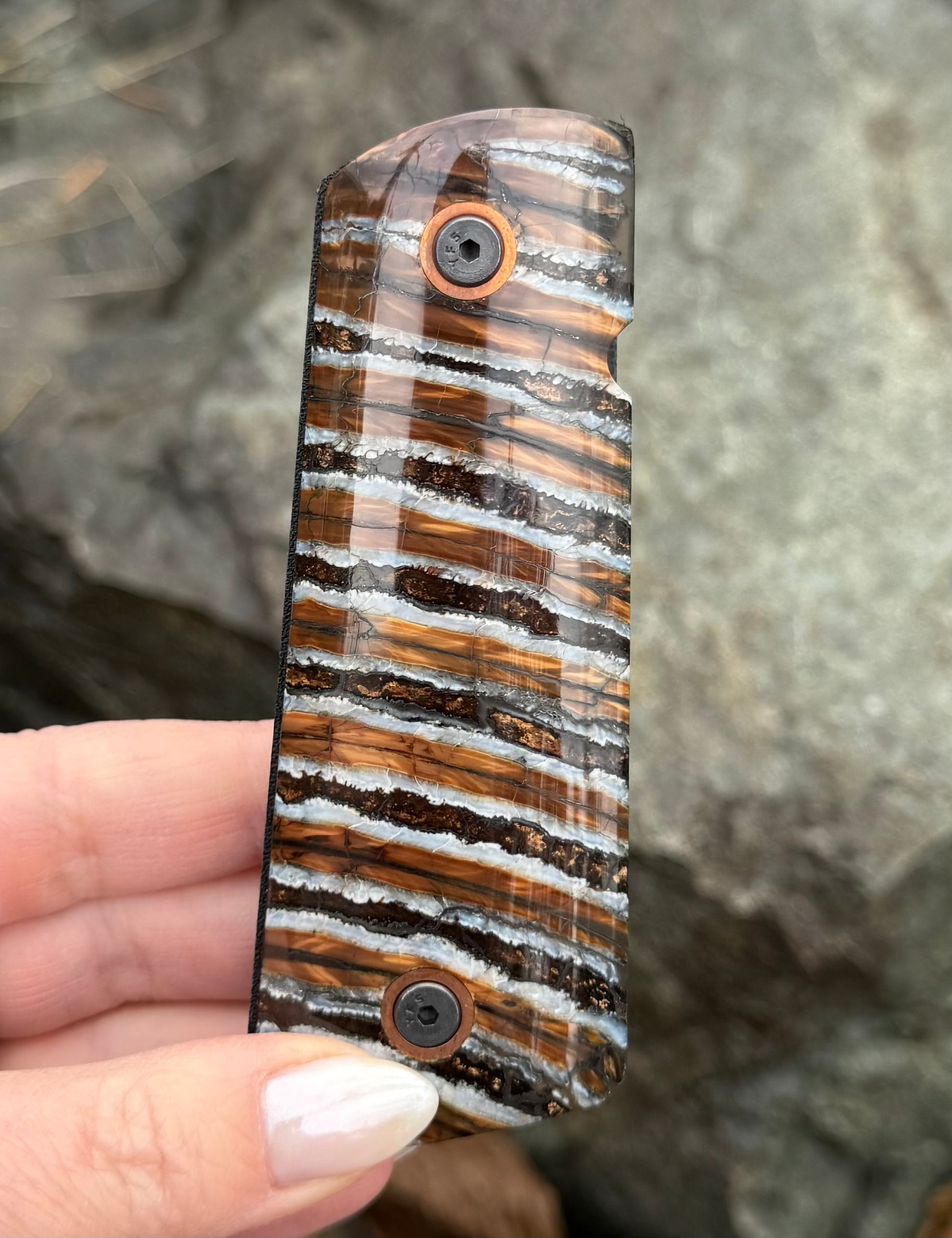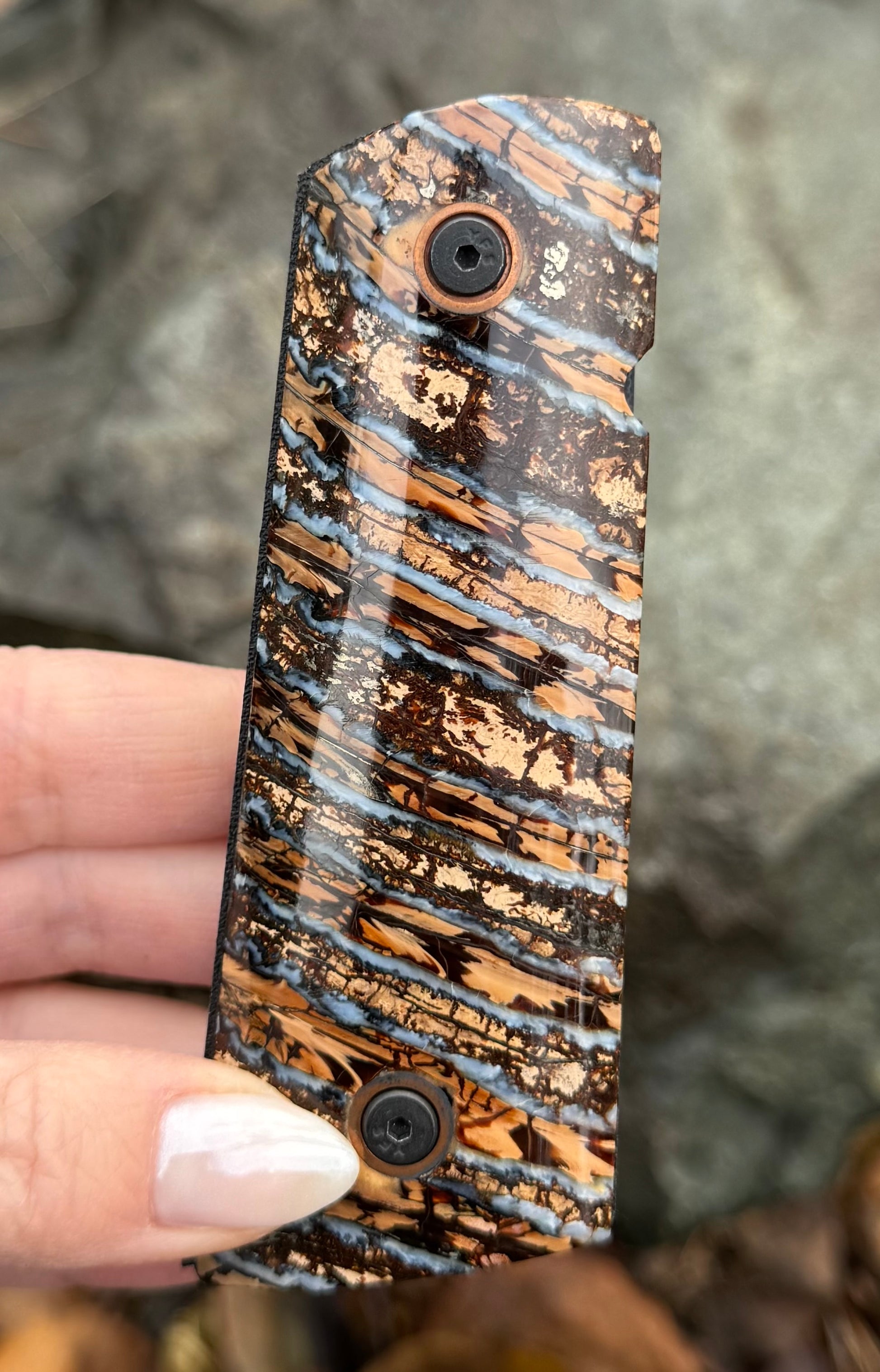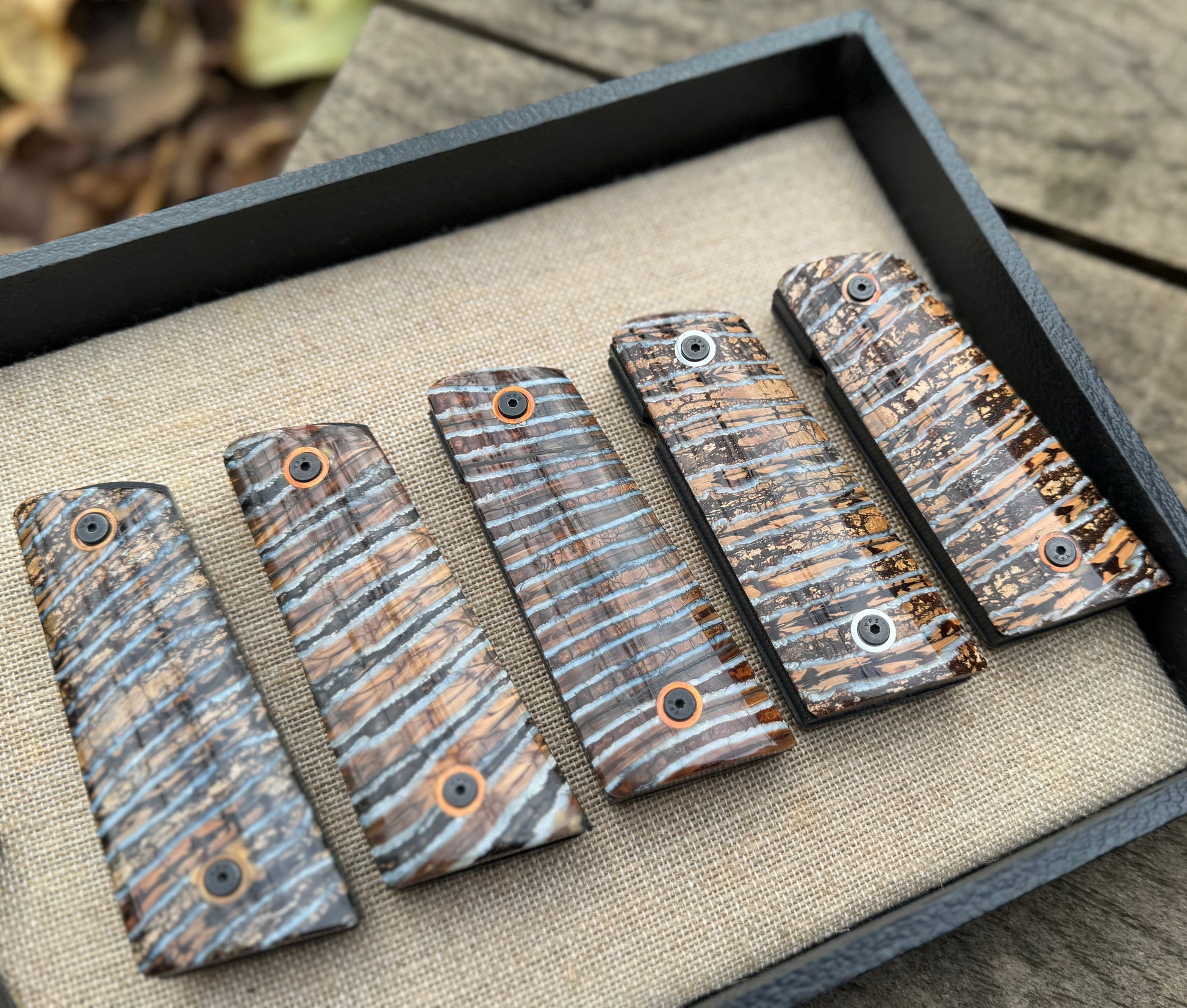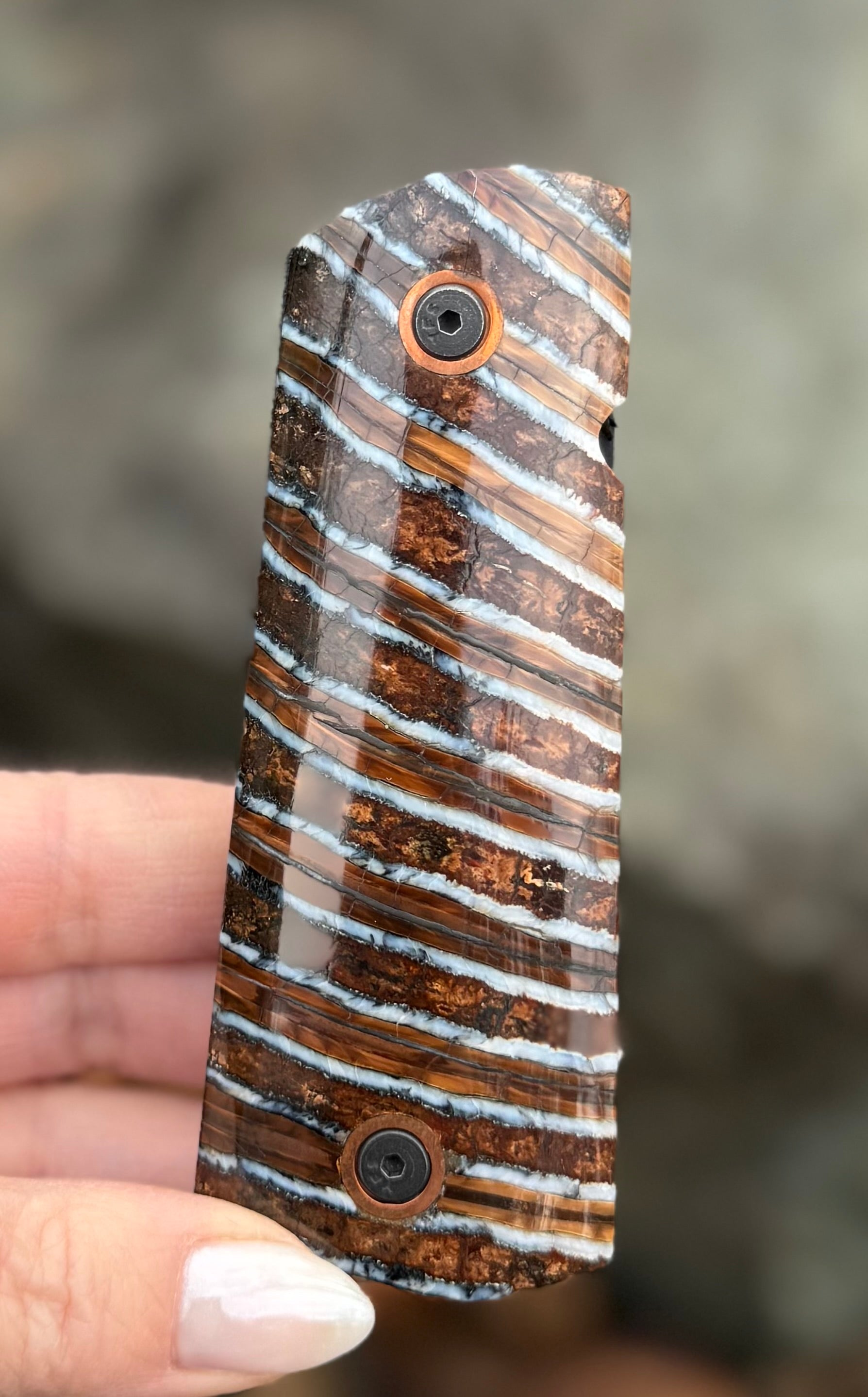 Your choice one of a kind prehistoric woolly mammoth tooth 1911 gun grip set. Features a 2 piece mammoth tooth 1911 grip set with G10 backing, and either brass or nickel sleeves.