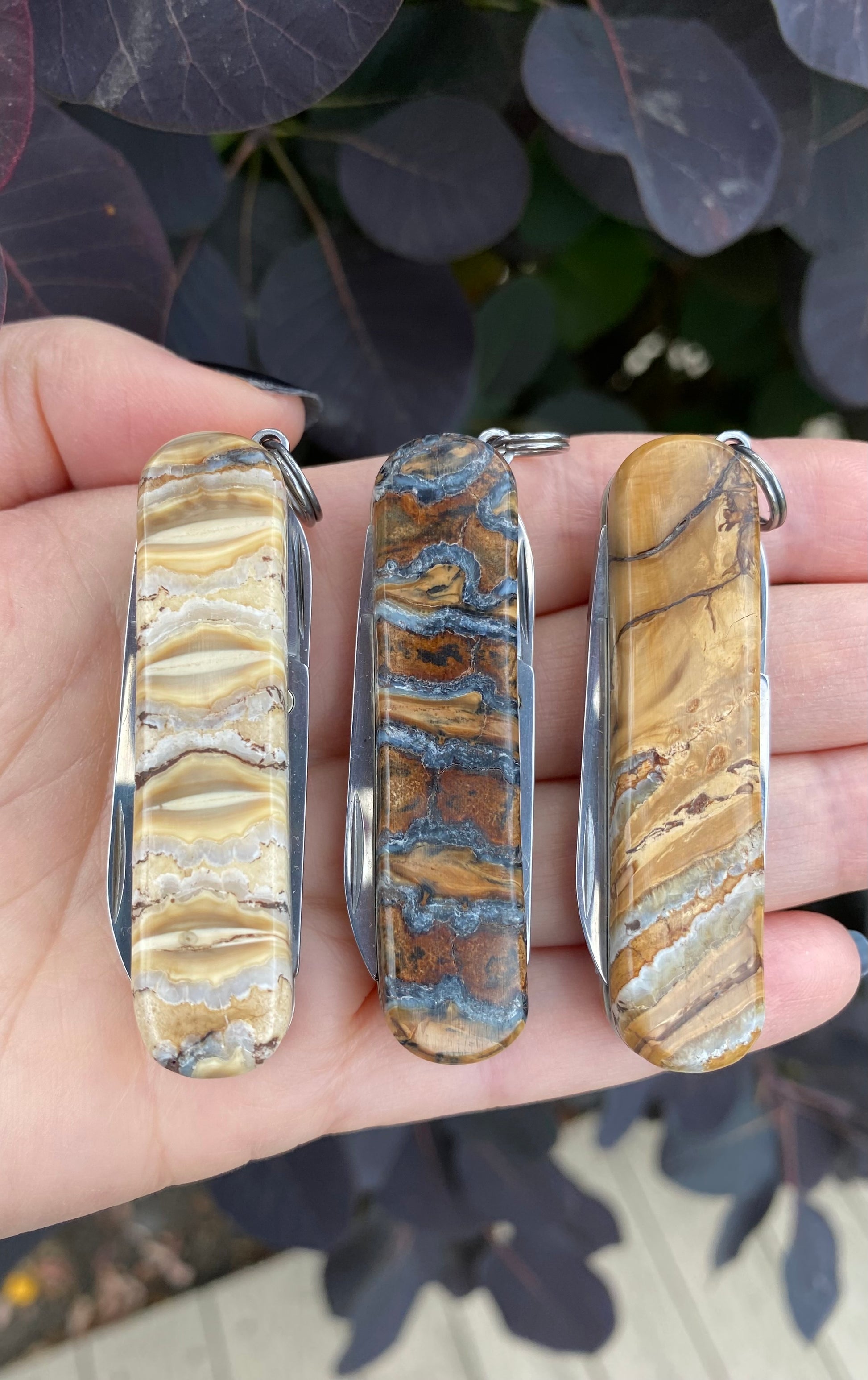 Mammoth ivory is cream, tan or brown in color, and woolly mammoth tooth features more wild patterns and striations with cream, tan, brown, white and/or gray tones. 2.3” approximate length. Listing is for one pocket knife with either mammoth ivory or mammoth tooth.