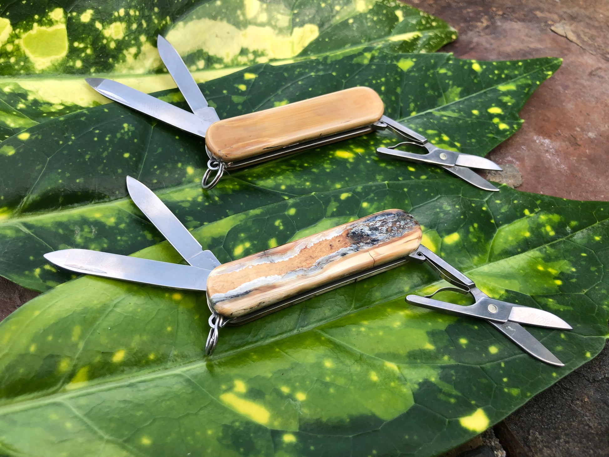 A classic Victorinox Swiss army knife with custom prehistoric woolly mammoth ivory or tooth handle.