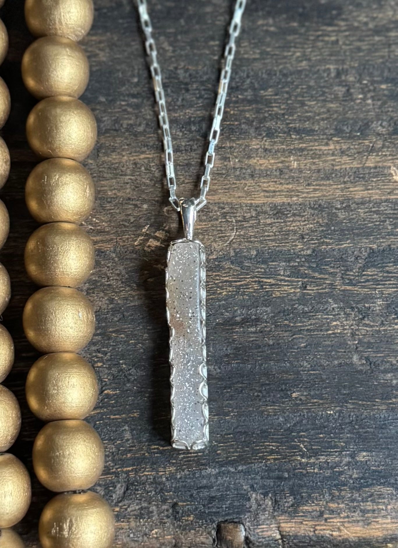 Sparkly natural druzy or purple amethyst bar pendants are set with rhodium plated sterling silver and finished with our signature open petals setting and bail. 2" long. Listing is for one pendant.