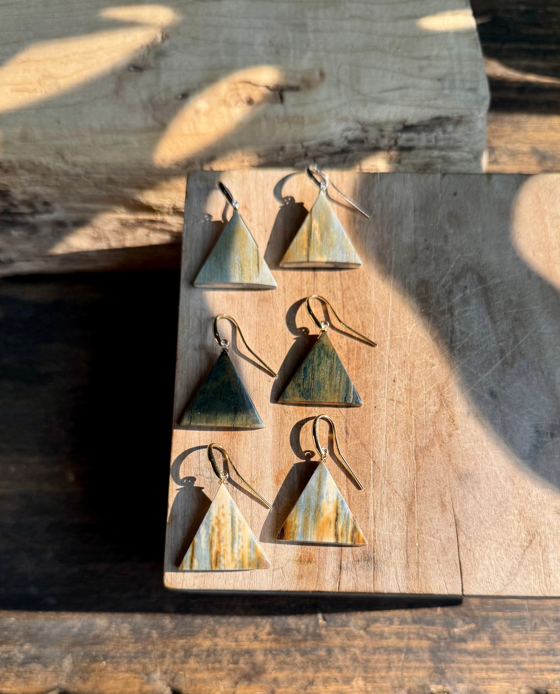 Each incredible pair of earrings are handmade from rare blue and/ or green accents prehistoric mammoth ivory and set with thick sterling silver or 14kt gold French hooks. Each pair is a one of a kind and may vary from photographed pair in color and patterning. Handmade in the USA.