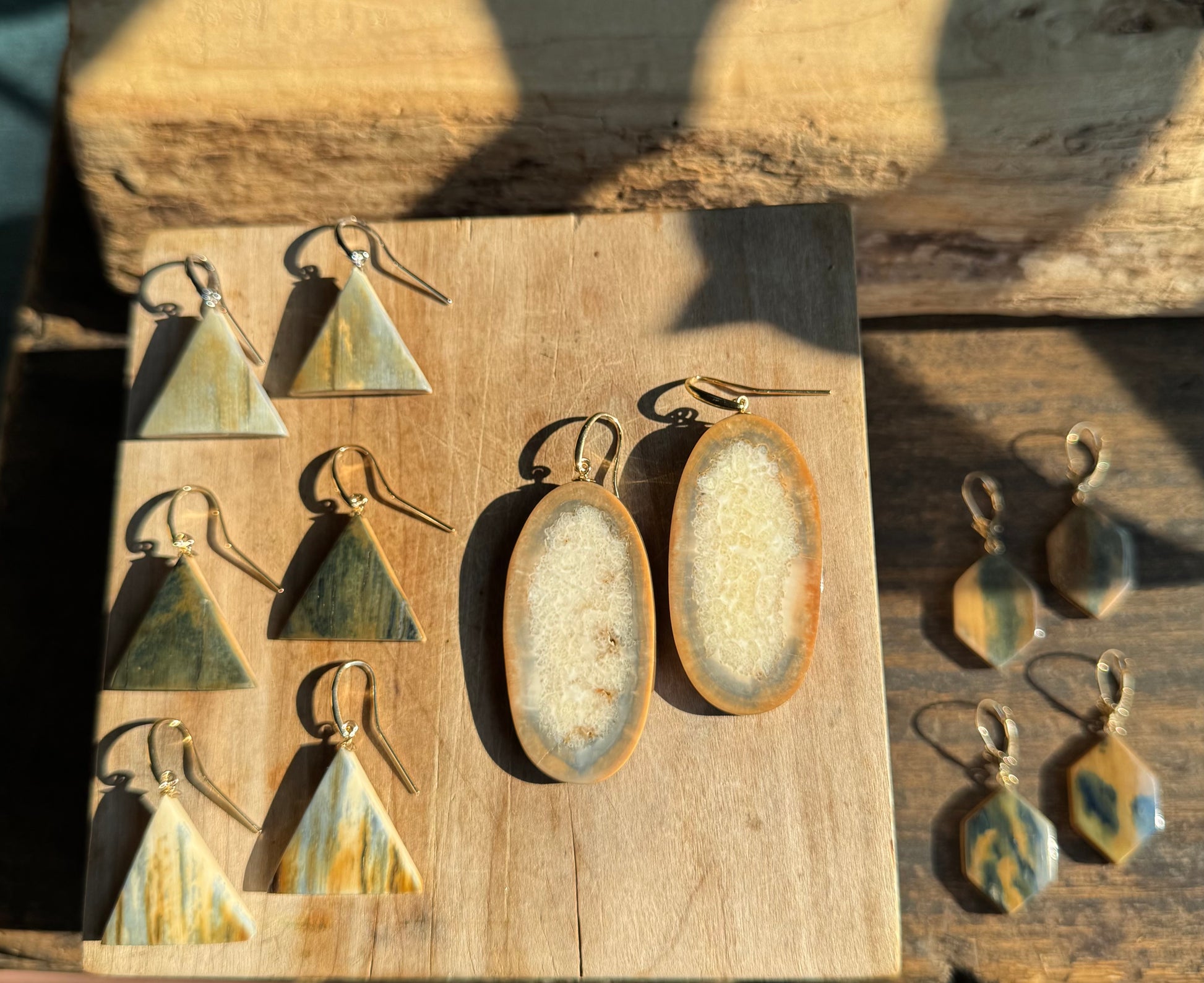 Stunning one of a kind blue, cream, and caramel fossil walrus tusk slice earrings set with solid 14kt gold thick french hooks. Handmade in the Pacific Northwest.