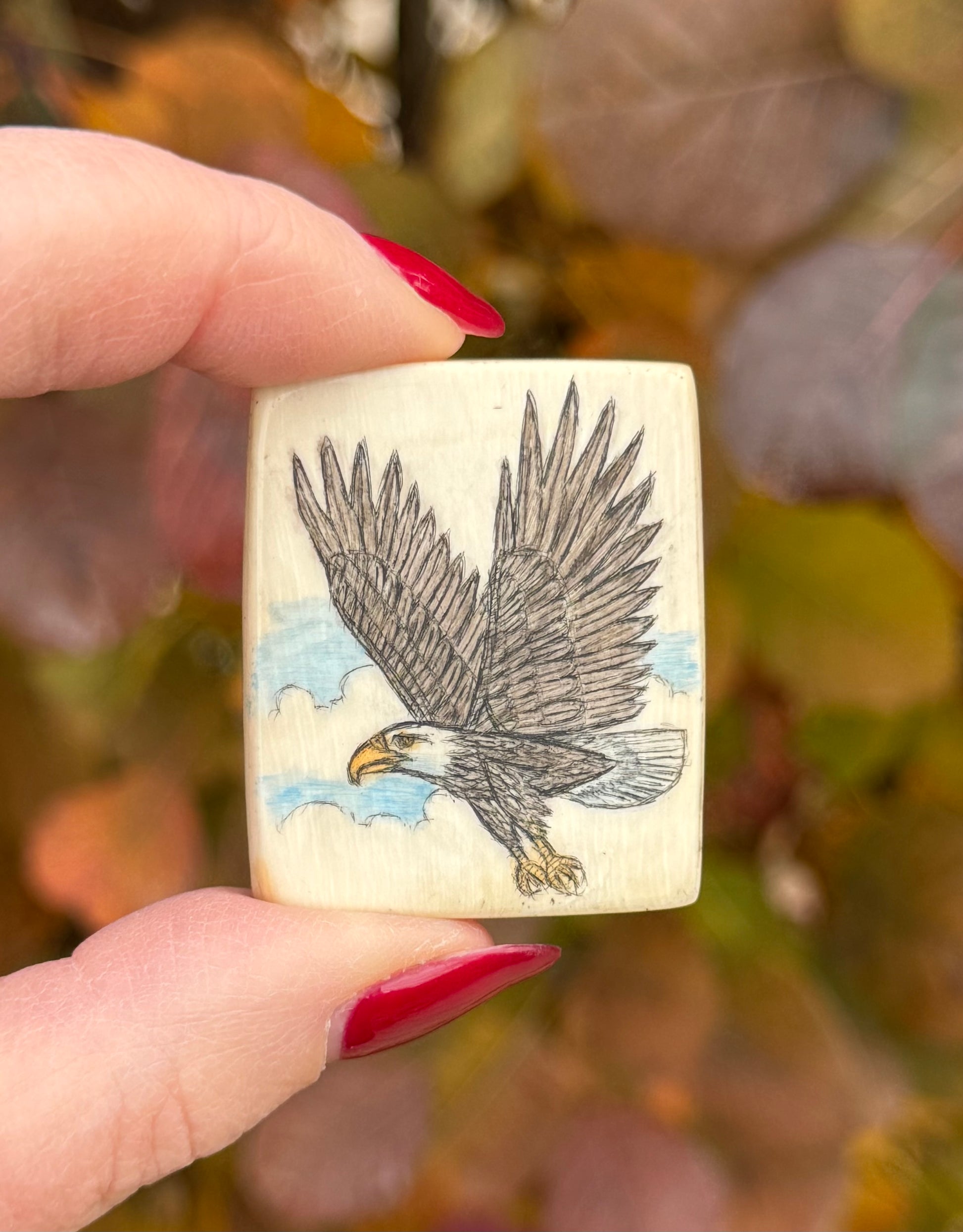 Each prehistoric woolly mammoth ivory tile is hand scrimshawed by master scrimshander, Peter Kinney, in the Pacific Northwest. Designs are sold individually and choices are currently: 3 Narwhal, 2 Orca, Flying Eagle.