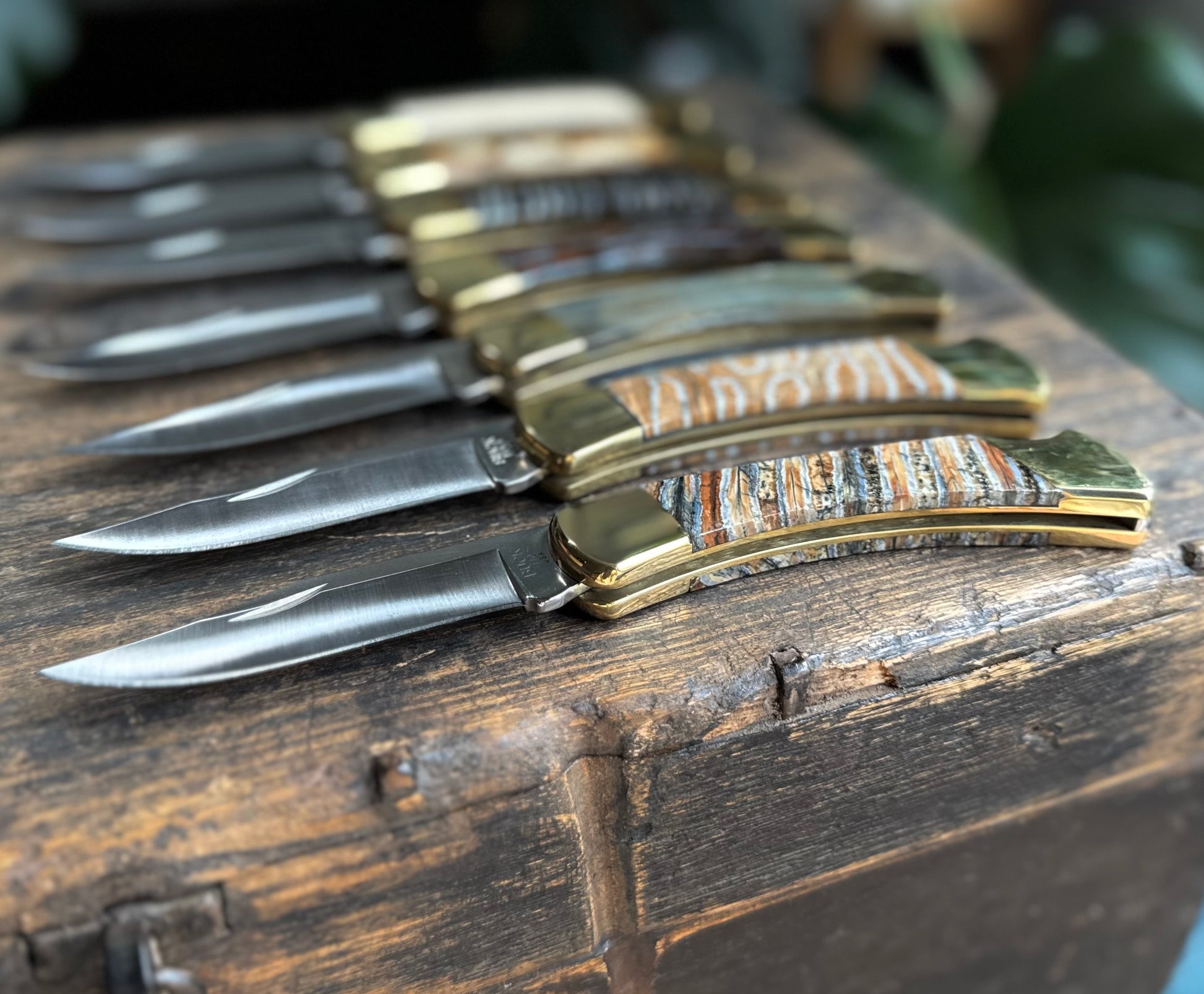 Meet the legendary Buck 110 Folding Hunter Knice now reimagined with a handle crafted from genuine prehistoric mammoth ivory or tooth, making each knife a one-of-a-kind piece of history. This iconic design features a 3¾” stainless steel clip point blade, polished brass bolsters, and the signature lock back mechanism that delivers strength and safety. Rugged yet refined, the Buck 110 combines timeless craftsmanship with ancient beauty, perfect for collectors, outdoorsmen, and anyone who appreciates rare materials and lasting quality.