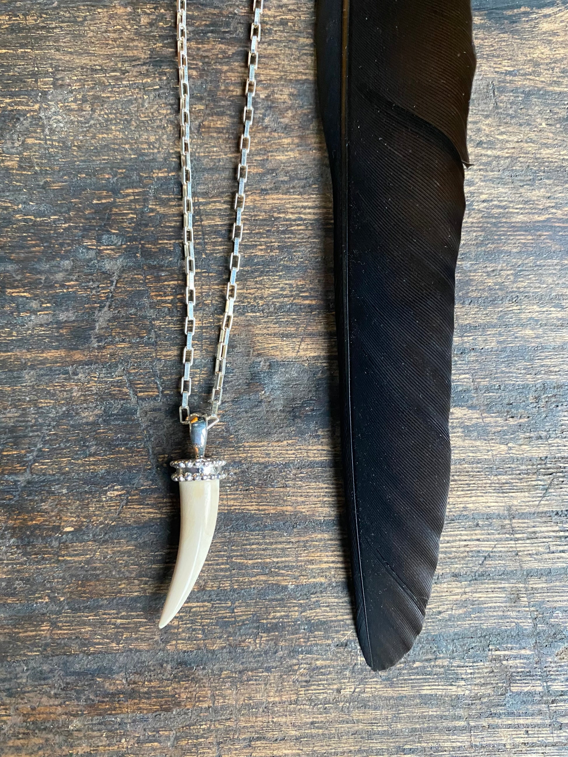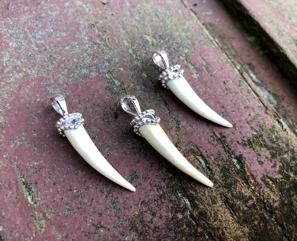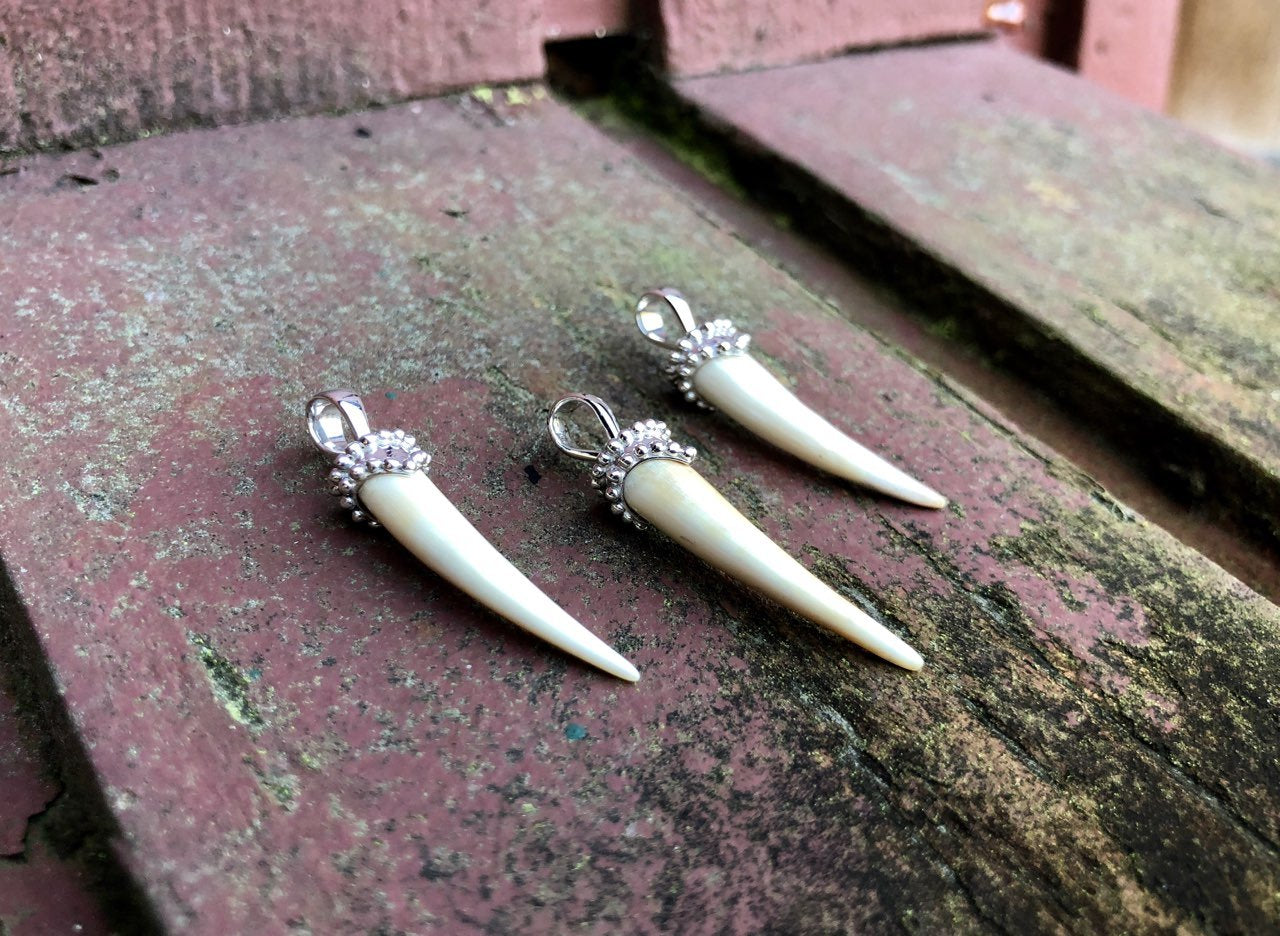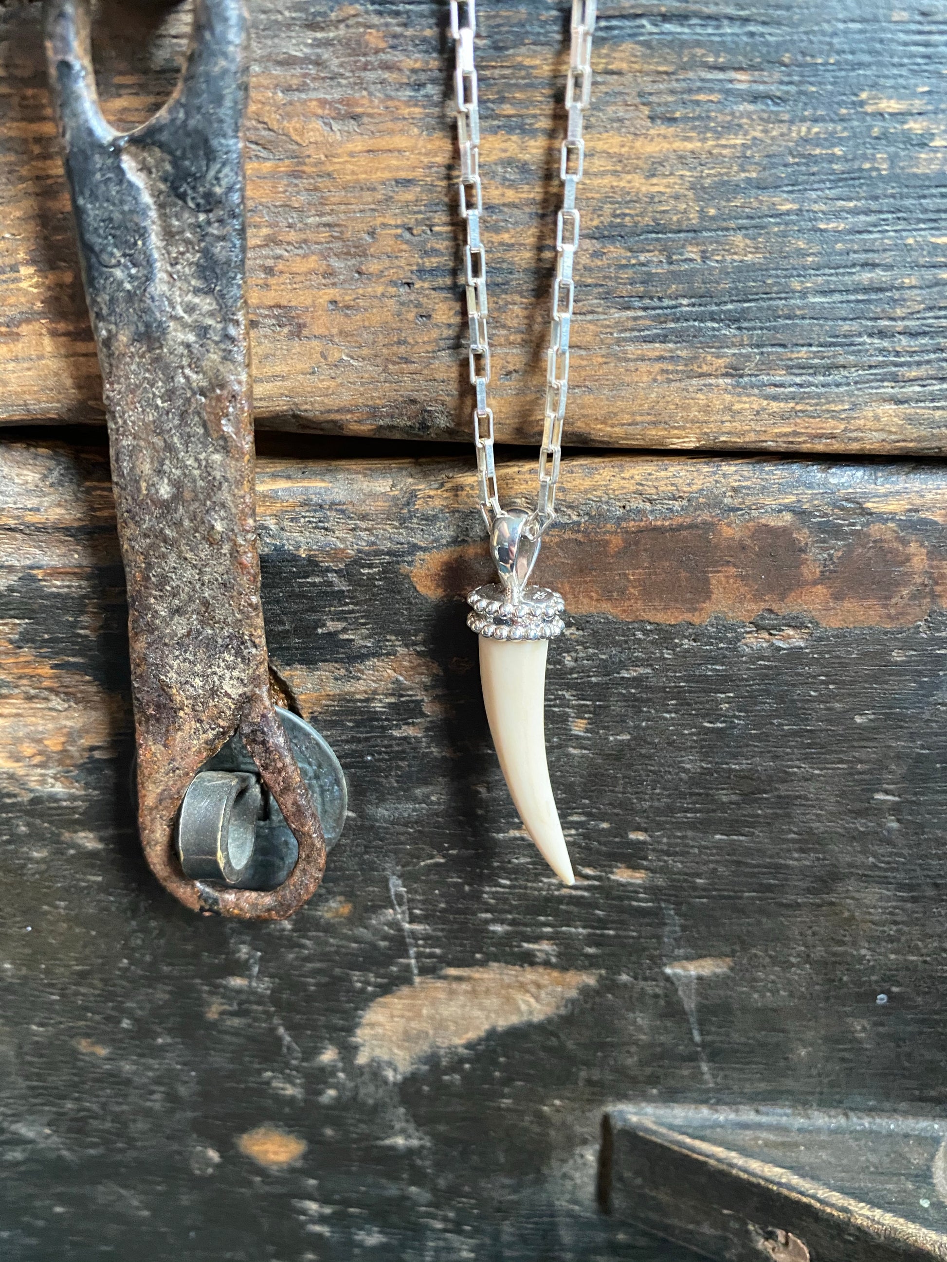 Beautiful prehistoric woolly mammoth ivory tusk shaped pendant set with rhodium plated sterling silver. Approximately 1.5" tall. Chain is sold separately in 18", 20", or 24" length.
